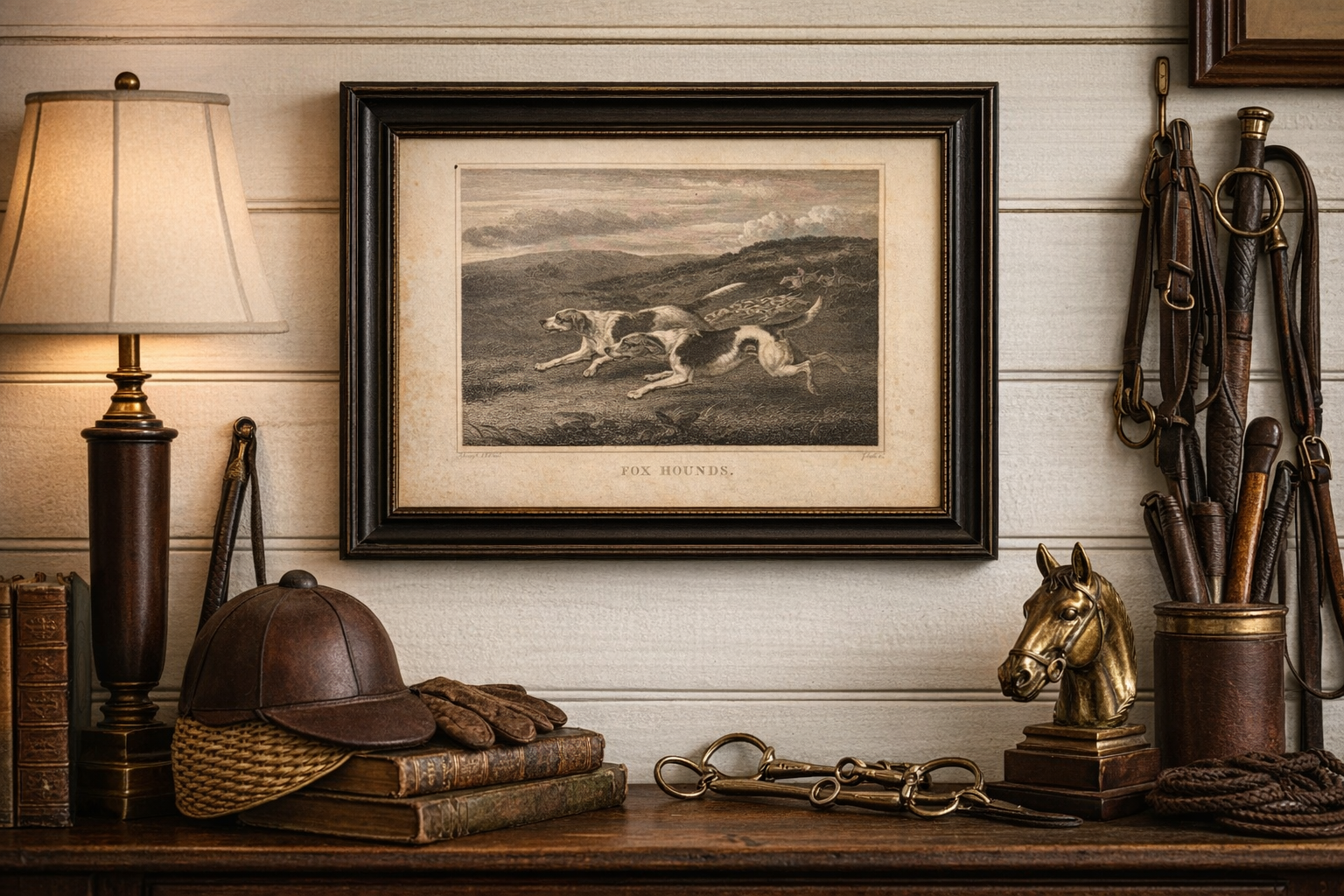 Frame in a gilt or dark wood frame with a generous mat and display among other hunting prints, equestrian artwork, and leather-bound books to create a classic Ralph Lauren–inspired sporting vignette.