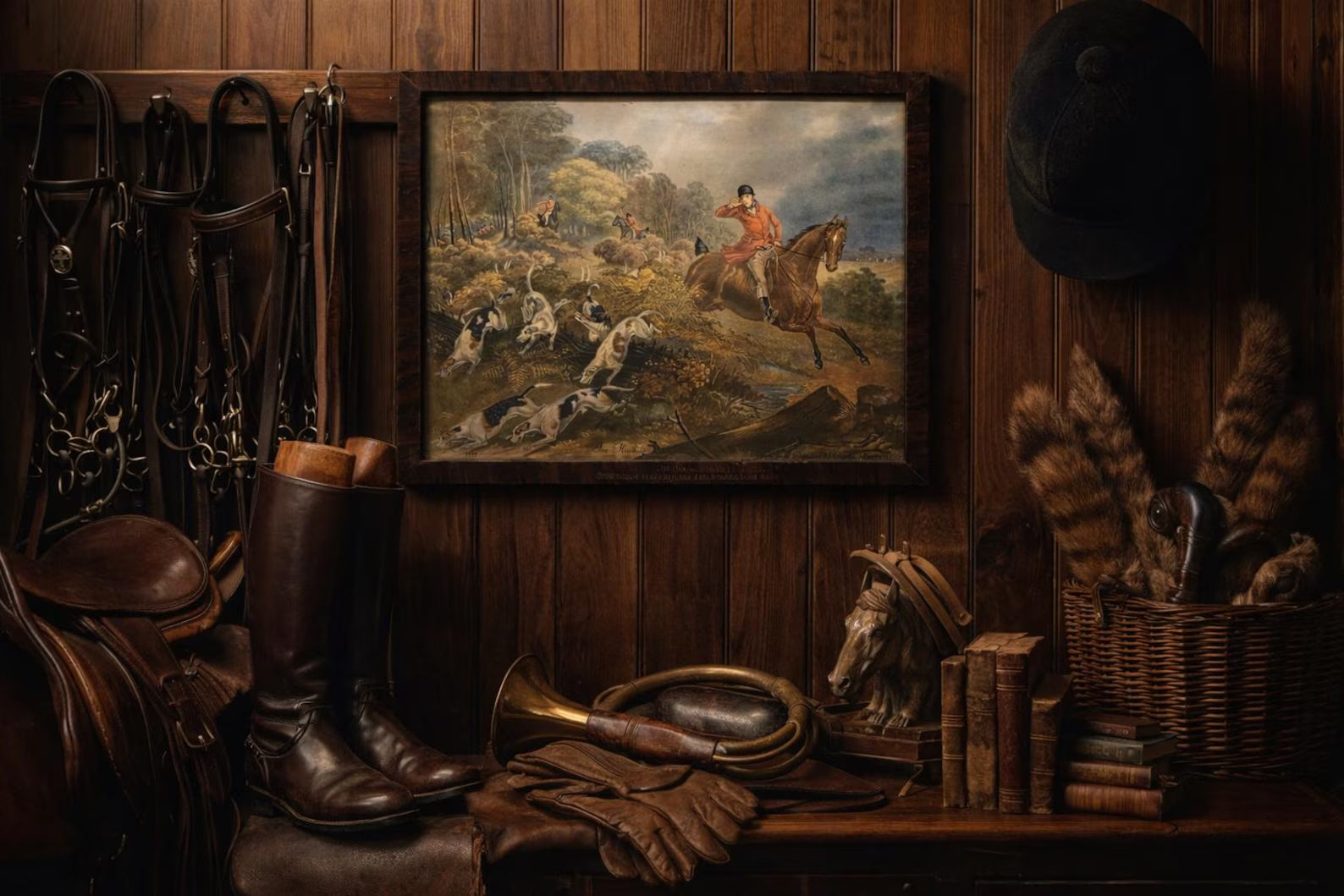 Style this piece in a study, library, or mudroom layered among leather-bound books, brass accents, and equestrian references. It pairs beautifully with dark woods, hunting prints, or hung salon-style with other sporting art for a collected English country look.