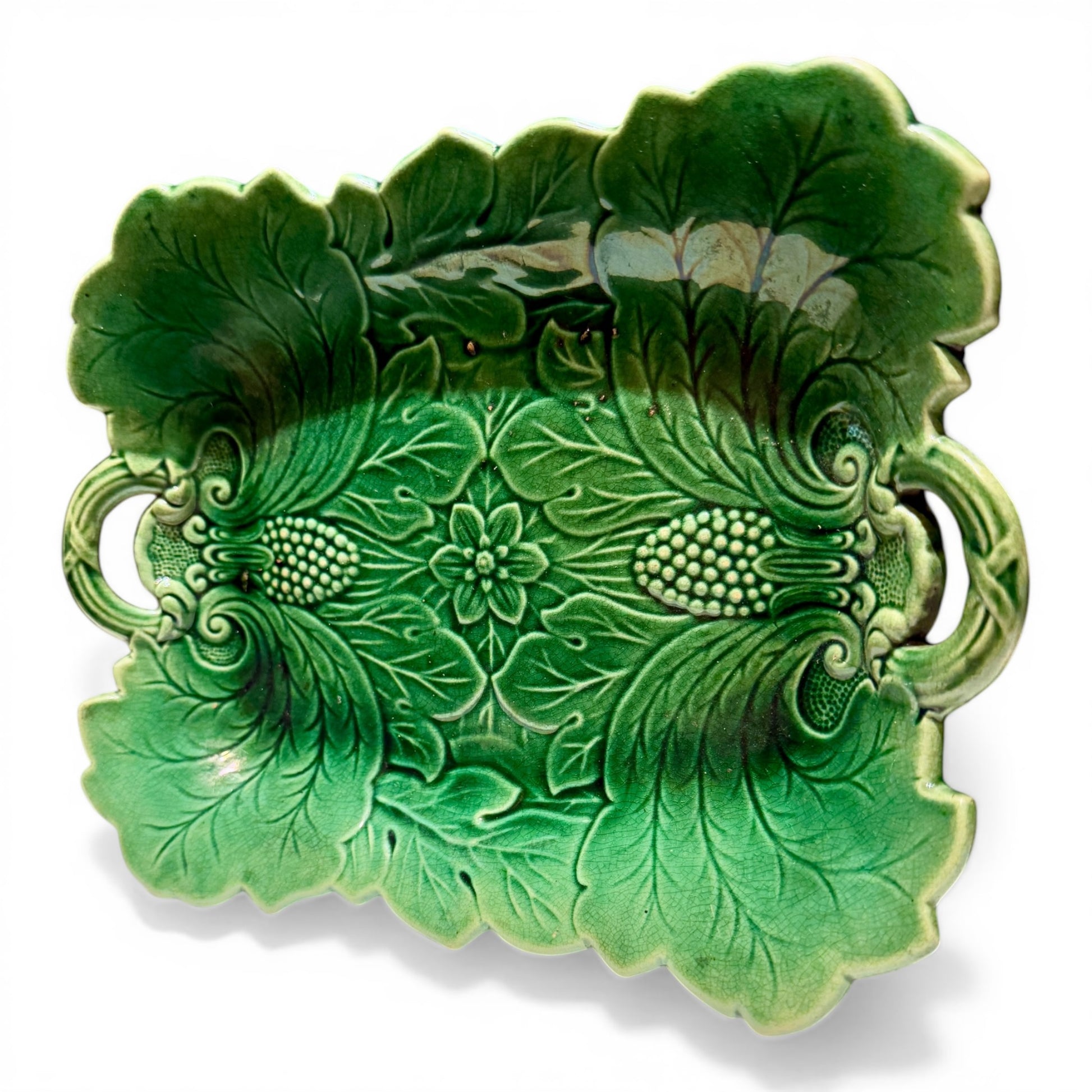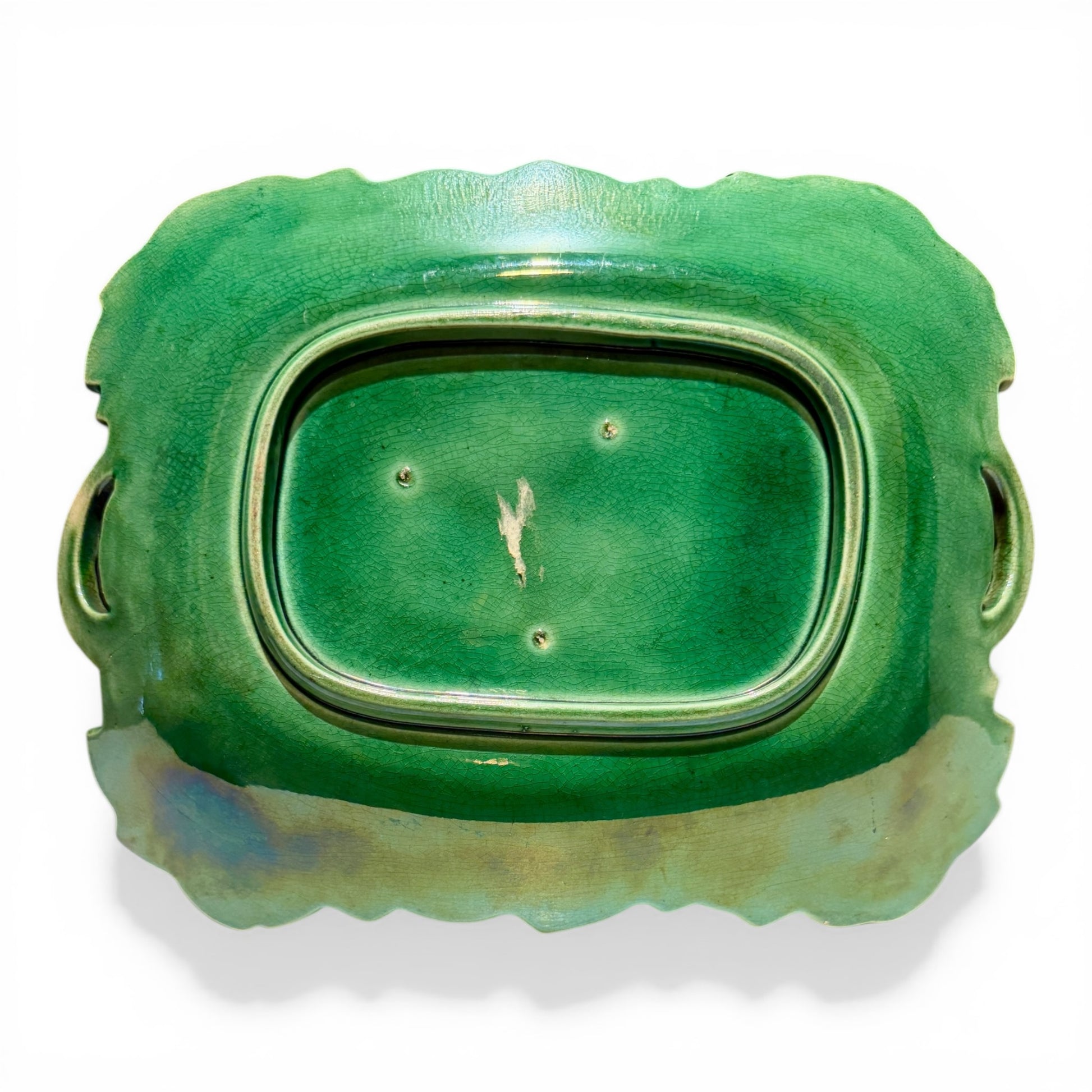 A richly sculptural green majolica platter featuring deeply veined botanical leaves and a striking central rosette, framed by elegant openwork handles. The saturated emerald glaze and high-relief detailing create a dimensional, almost lifelike presence—an iconic example of majolica’s enduring appeal. This piece embodies the English country aesthetic at its finest—equally at home layered into a kitchen vignette, styled on open shelving, or used as a serving statement for elevated entertaining.