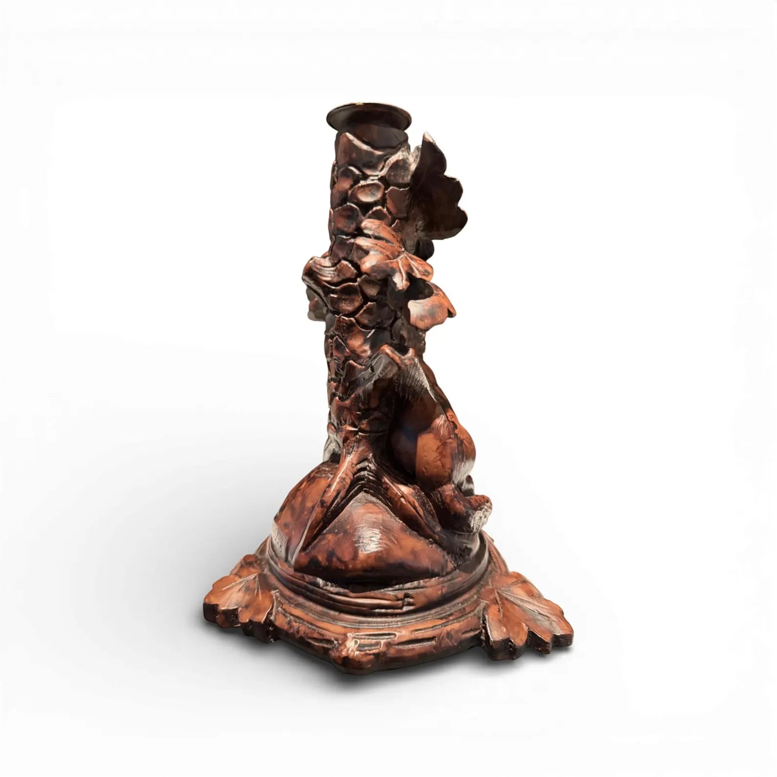This striking candelabra captures everything we adore about Black Forest style: narrative carving, woodland romance, and unmistakable presence. The fox—poised alertly among deeply modeled oak leaves—feels both whimsical and refined, making this an ideal accent for an English country interior, equestrian home, or curated lodge-style space.