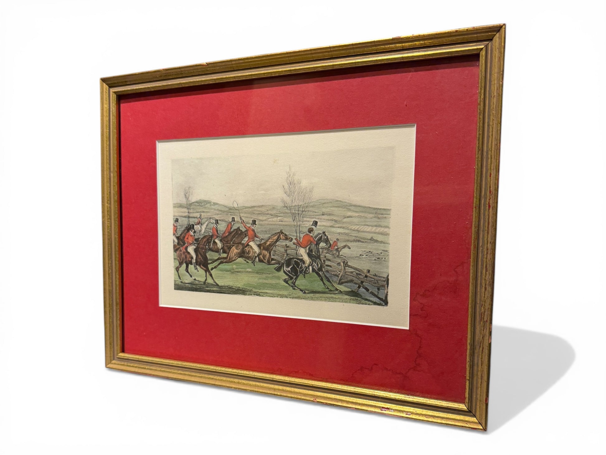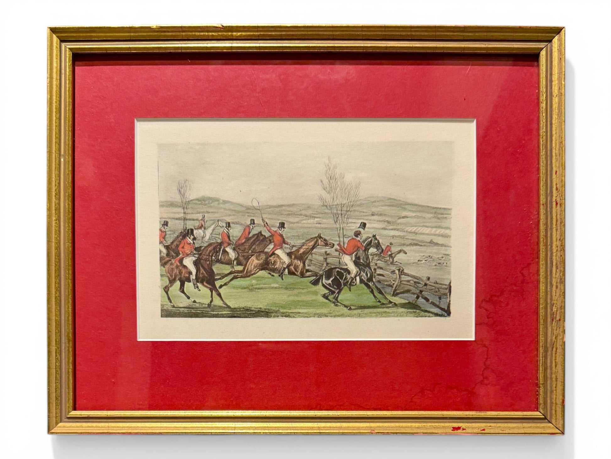 A beautifully composed antique fox hunting lithograph depicting a classic hunt scene—riders in traditional scarlet coats mid-jump across a rustic countryside fence. Sourced from a distinguished equestrian estate in Millbrook, New York, this piece carries an authentic sporting heritage that is both timeless and deeply evocative of English country tradition.