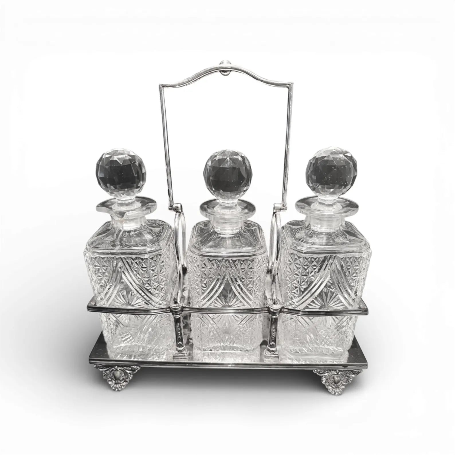 Unmarked, as is common with antique silver-plate tantalus sets of this period.