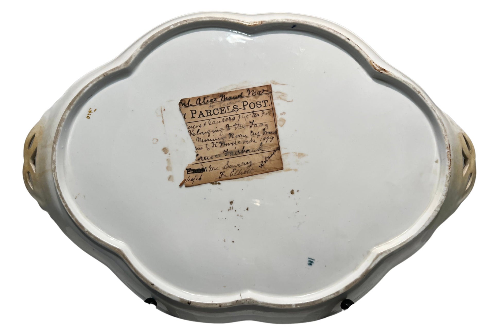 The cabaret tray retains its original handwritten parcels-post owner’s label dated 1879, a remarkable survival that provides rare period documentation and firmly anchors the set to the late Victorian era, making this example particularly special and exceedingly uncommon.