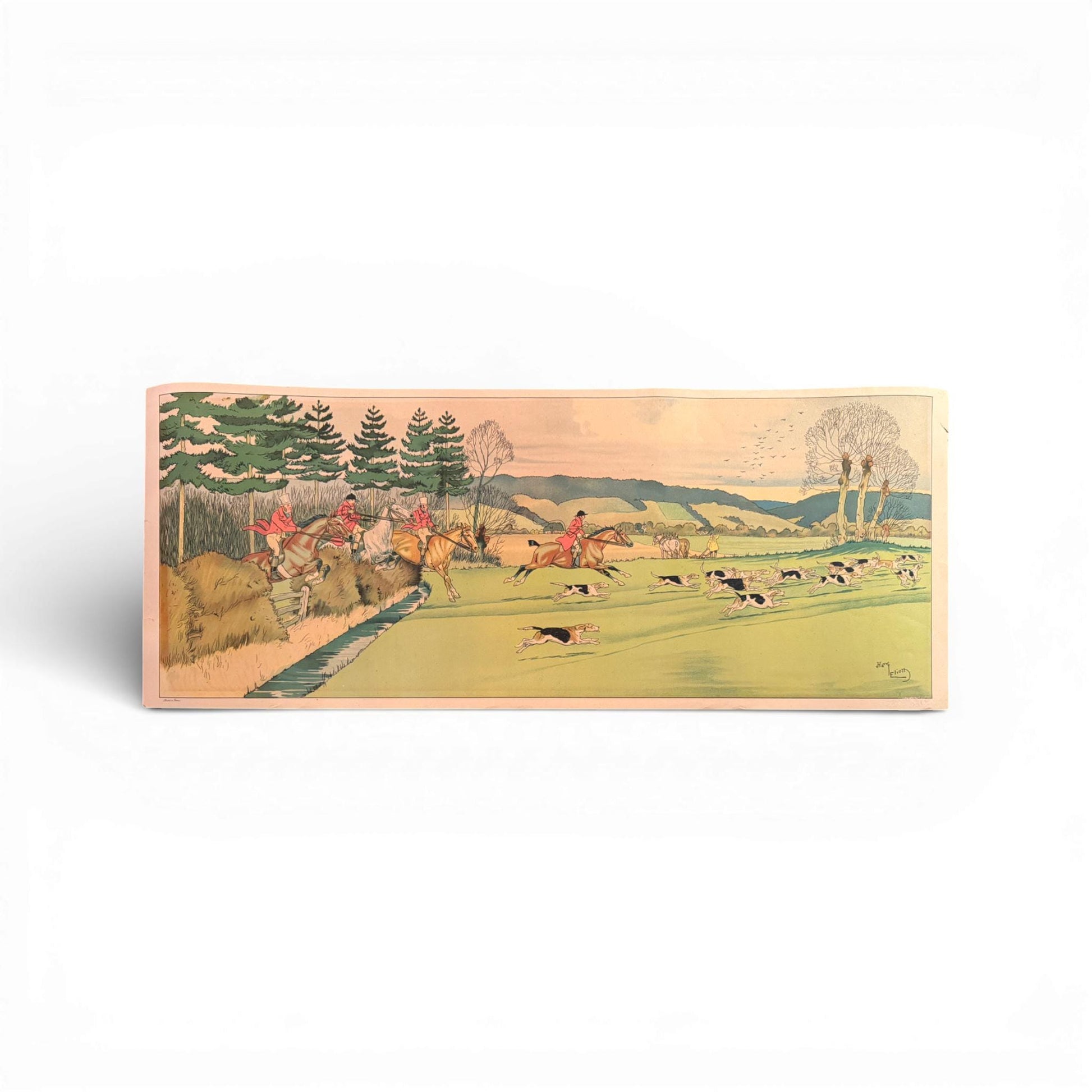 Rendered in soft, painterly color with exquisite line work, the piece balances motion and elegance, offering both narrative energy and atmosphere. The panoramic format makes it especially striking when framed, allowing the drama of the hunt to be appreciated in full.