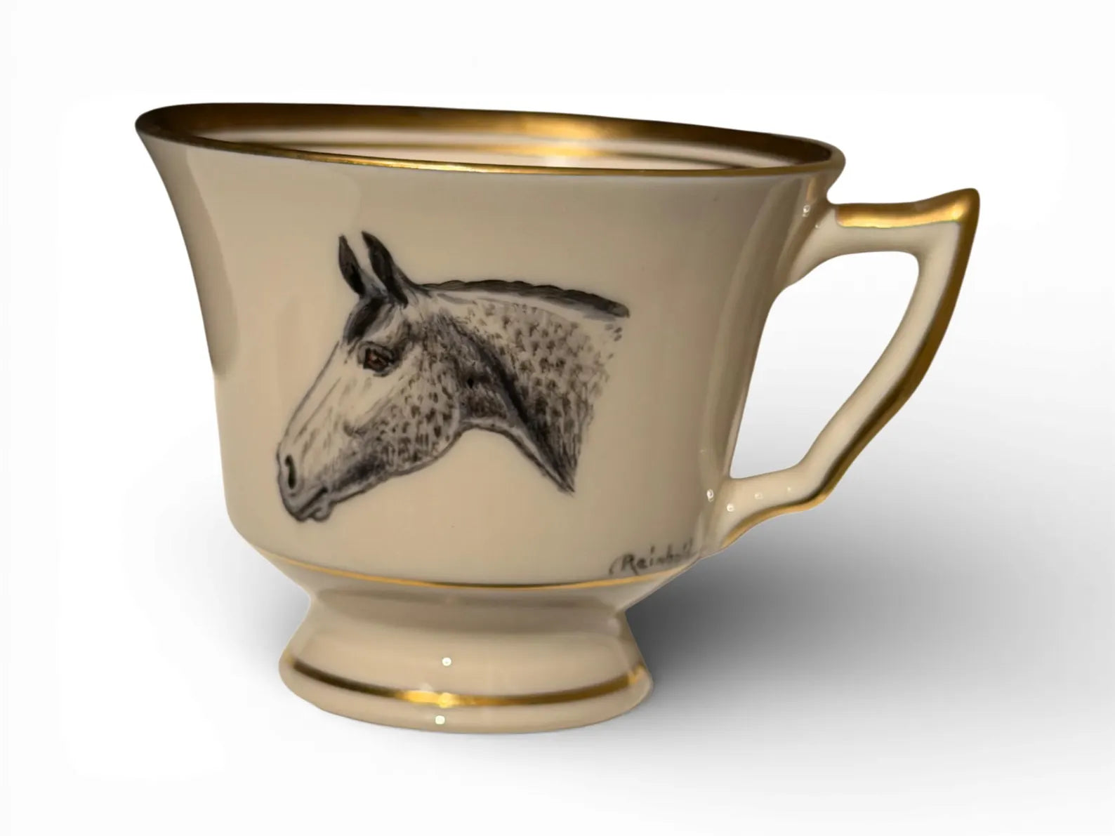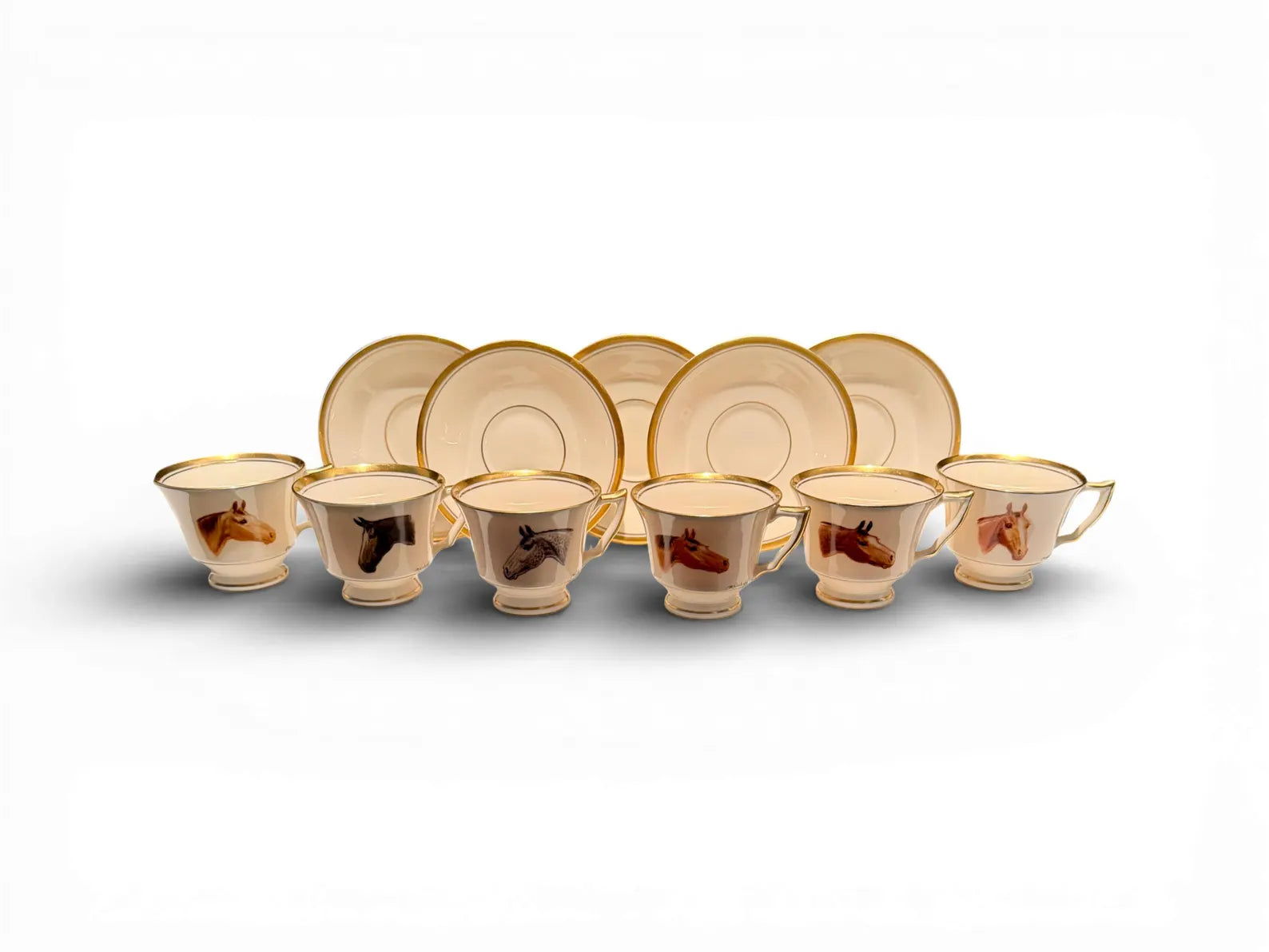 This is a truly special and increasingly hard-to-find set. Each cup features a distinct hand-painted horse portrait, rendered with remarkable expression and character — no two are alike. The artistry speaks directly to classic equestrian heritage, making this set equally at home in a formal tea service, an English country vitrine, or styled on open shelving in a well-appointed kitchen or butler’s pantry. Signed examples with complete matching saucers are particularly desirable, and the cohesive yet varied portraits elevate this from a simple service to a collector-worthy display set.
