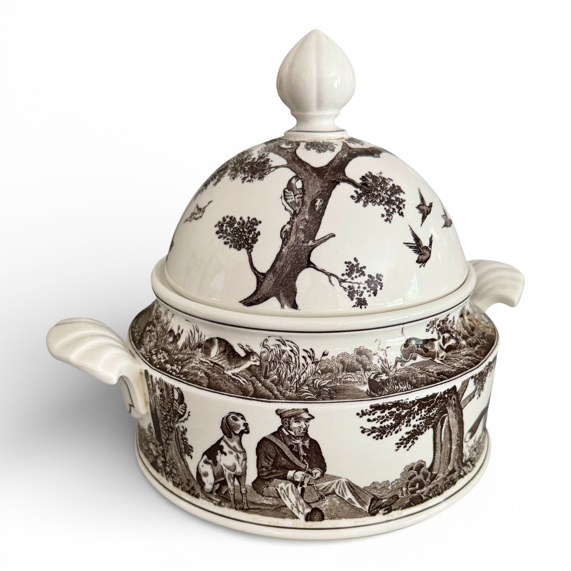 An exceptional and increasingly scarce Villeroy & Boch “Anjou” porcelain lidded tureen, produced in 1887 and handcrafted in Germany. This piece features a richly detailed, continuous fox hunt scene rendered in a classic transferware style, wrapping the body in a narrative of hounds in pursuit beneath wooded landscapes. The domed lid is equally refined, adorned with birds in flight and finished with an elegant sculptural finial.