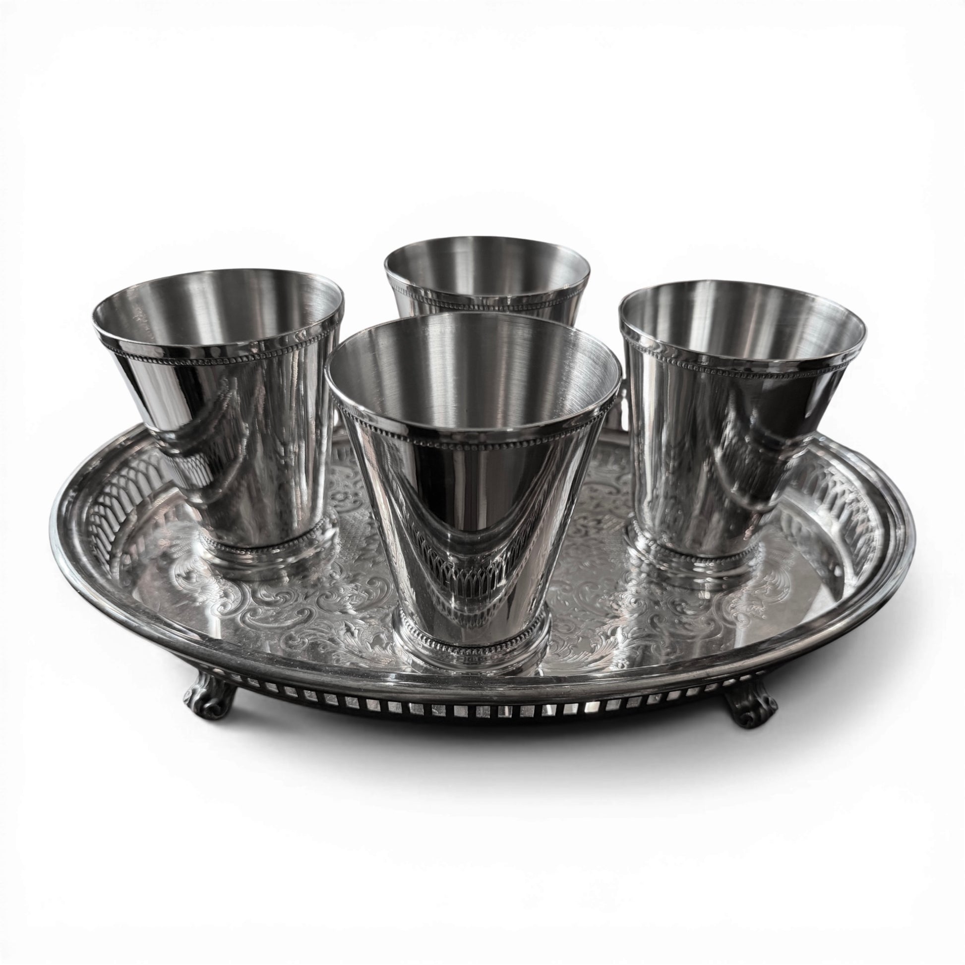 Vintage Beaded Rim Silver Julep Cups & Footed Oval Tray - Set
