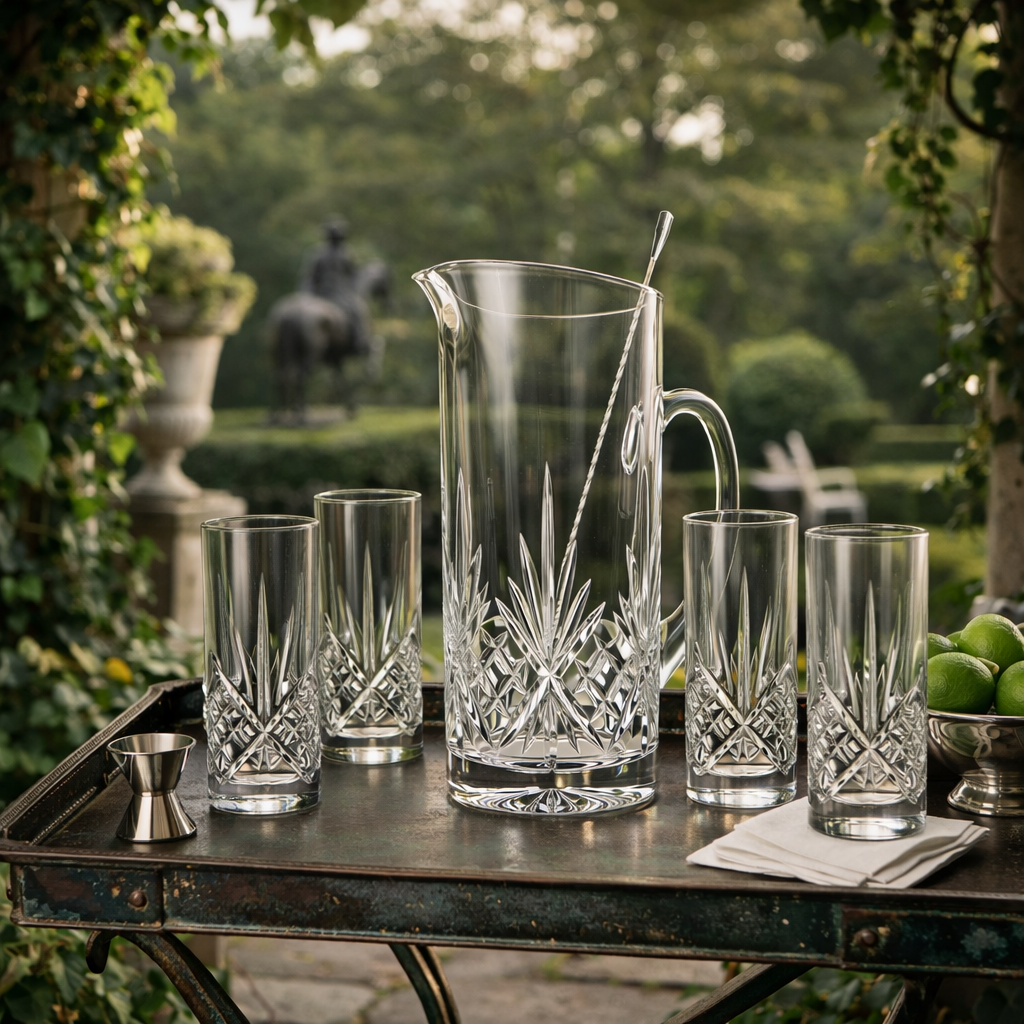 This vintage non-leaded crystal Tom Collins pitcher and glassware set features crisp vertical cuts and a classic crosshatch base, offering a timeless accent for the well-appointed bar. Both functional and decorative, it is ideal for cocktail service, entertaining, or elegant display.