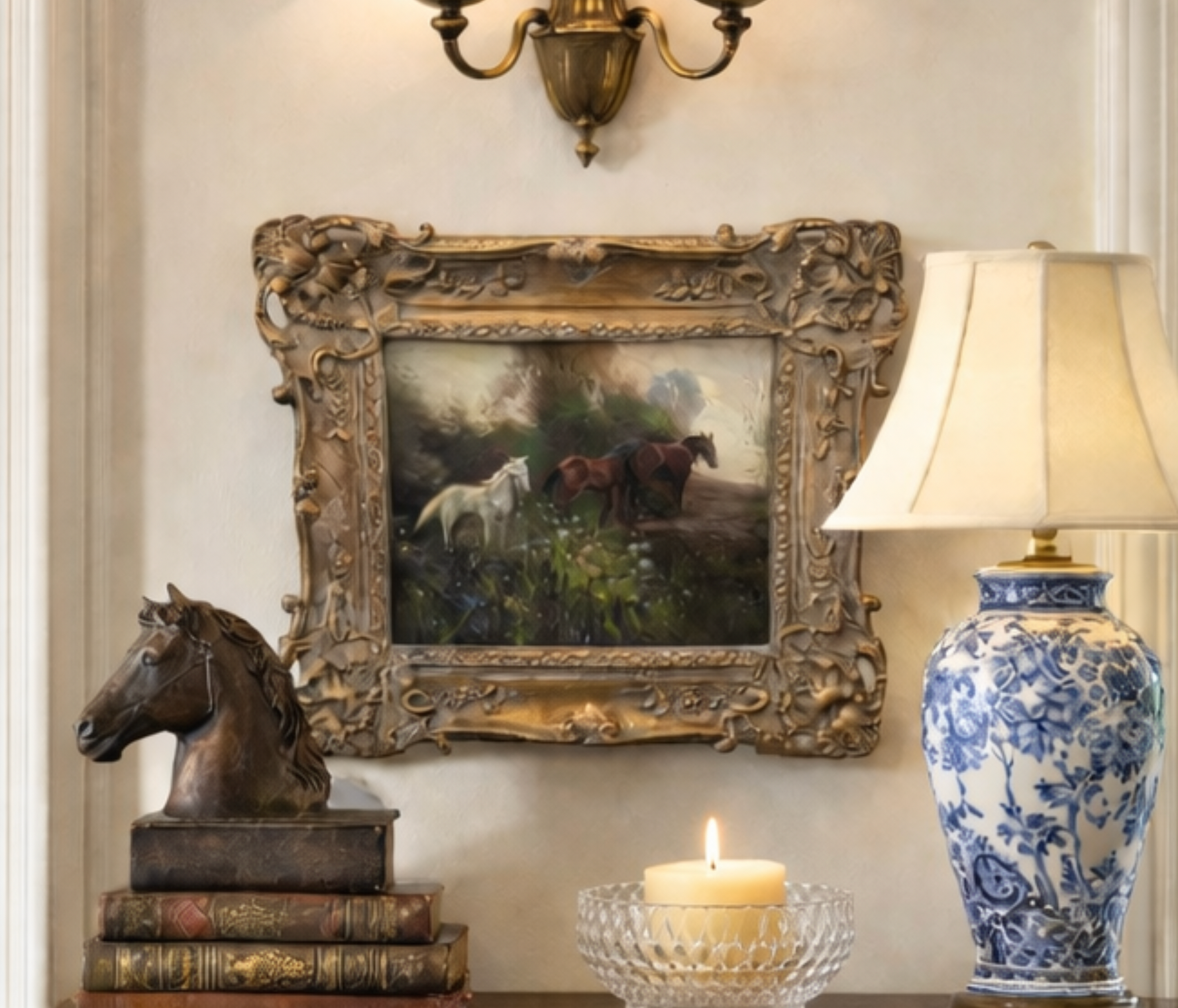 This piece captures everything we admire about traditional equestrian art—the strength of the horses, the moody landscape, and the romantic spirit of the countryside. Whether styled alone or layered within a gallery wall, it brings depth and heritage character to a room.