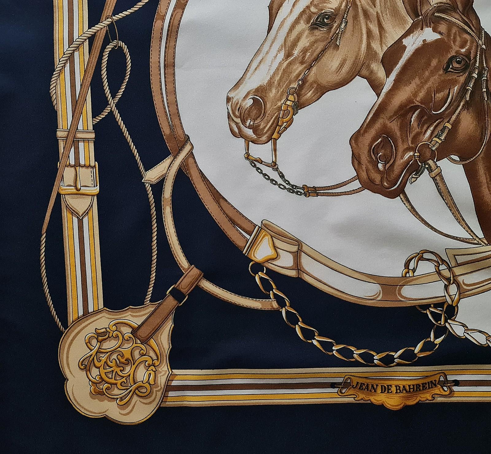 A beautifully illustrated vintage silk scarf by Jean de Bahrein, featuring two bridled horses framed within an intricate arrangement of classic riding tack — reins, bits, stirrups, and braided leatherwork — all rendered in rich chestnut, gold, and ivory tones against a deep navy ground.