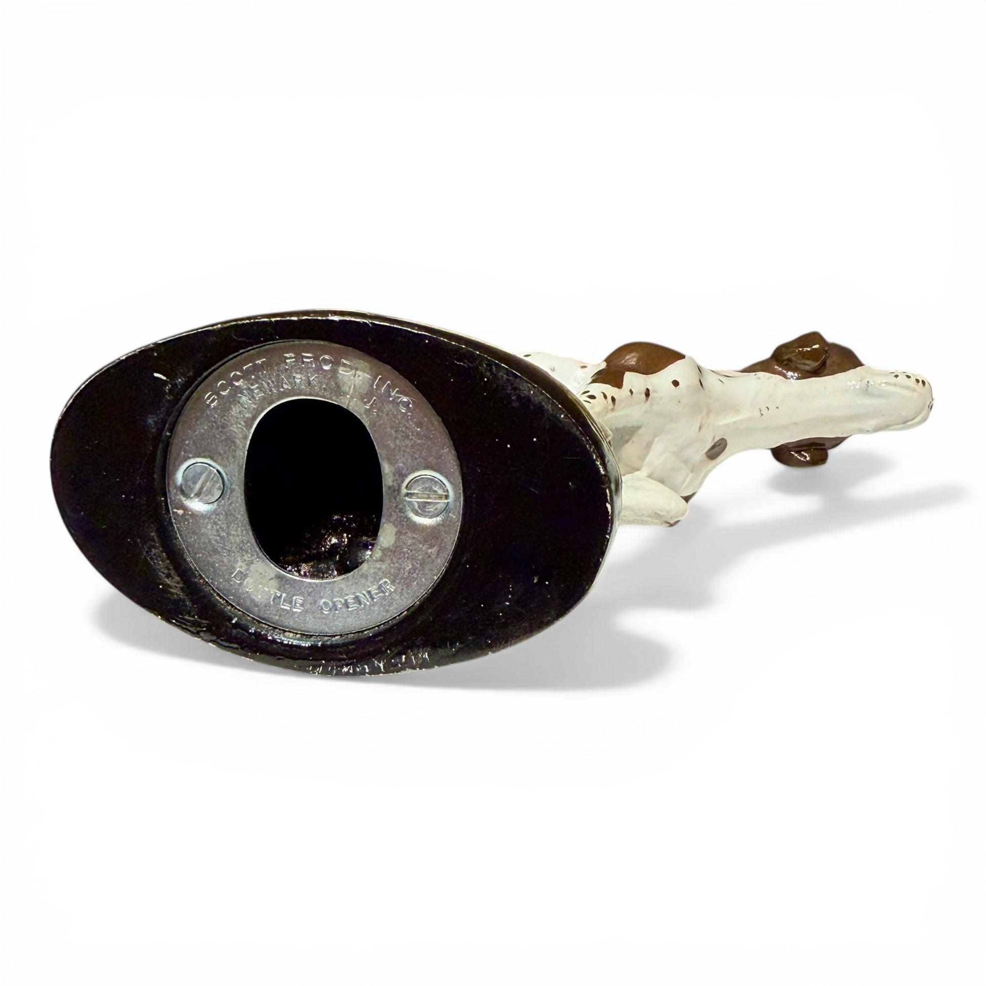 A charming vintage hunting dog bottle opener with wonderful sporting character and classic brown-and-white markings, mounted on a naturalistic base. Petite in scale but full of personality, this is the kind of piece that adds instant warmth to a bar, bookshelf, or study styled in an English sporting mood.