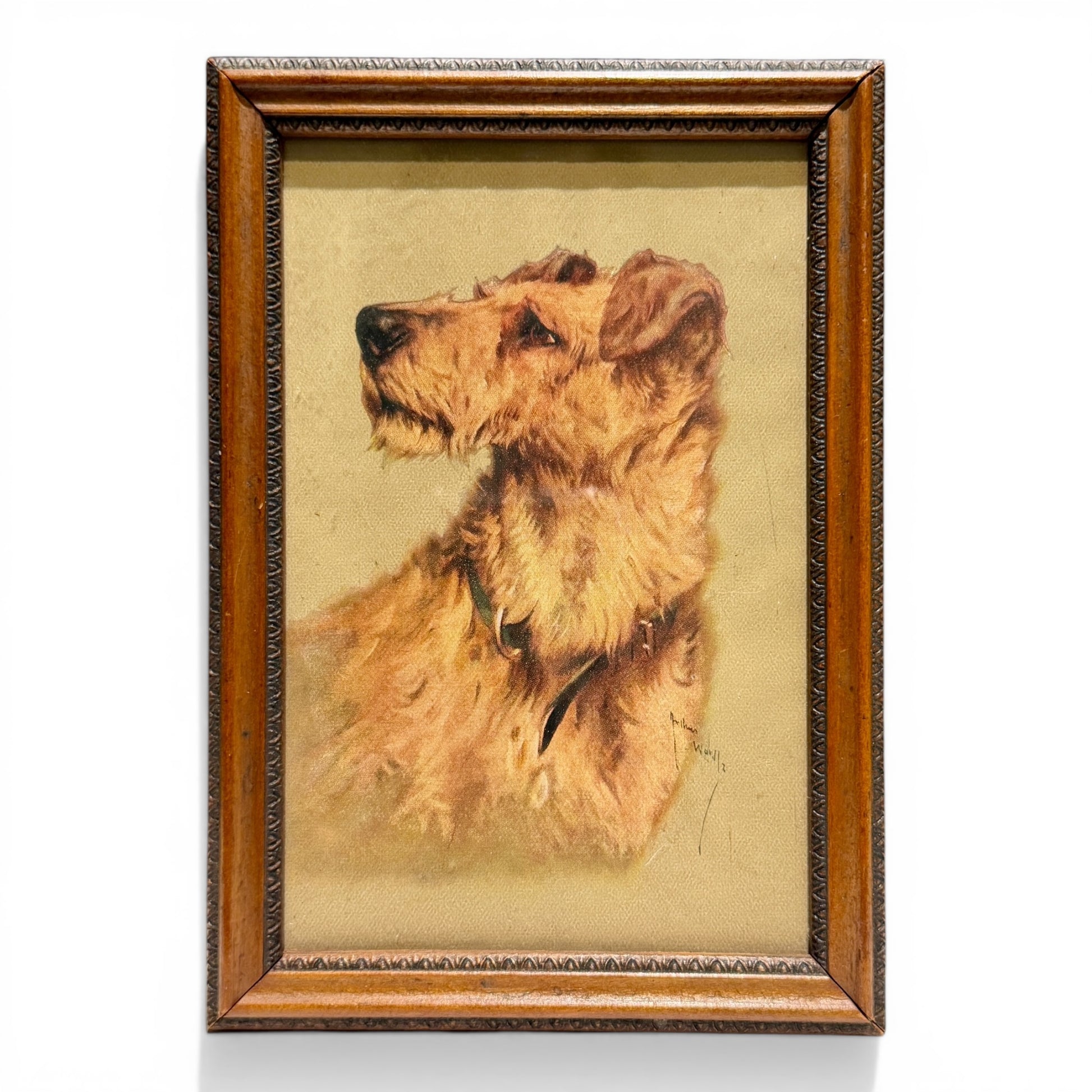 Stylistically, this piece aligns with early-to-mid 20th century decorative prints inspired by British animal portraiture—often found in libraries, studies, and country homes where sporting life and canine companionship were part of daily ritual. The subject’s alert posture and textured coat are reminiscent of terrier breeds such as Irish or Border Terriers, long favored in English country circles.