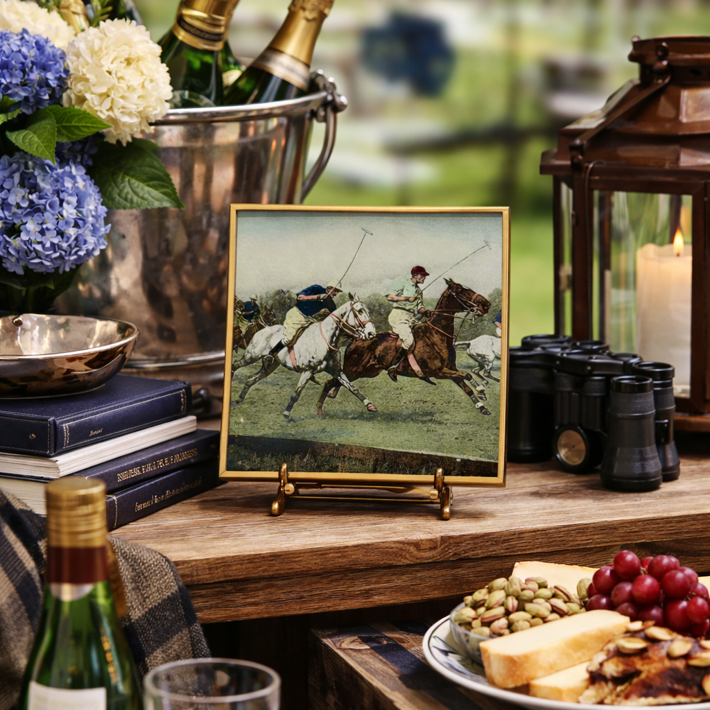 A charming and sporting accent, this petite glass trinket dish captures the thrill of a classic polo match in motion—bringing equestrian heritage and timeless English style to even the smallest corner of your home. Finished with delicate gold trim and backed in velvet, it offers both beauty and function in a perfectly scaled piece.