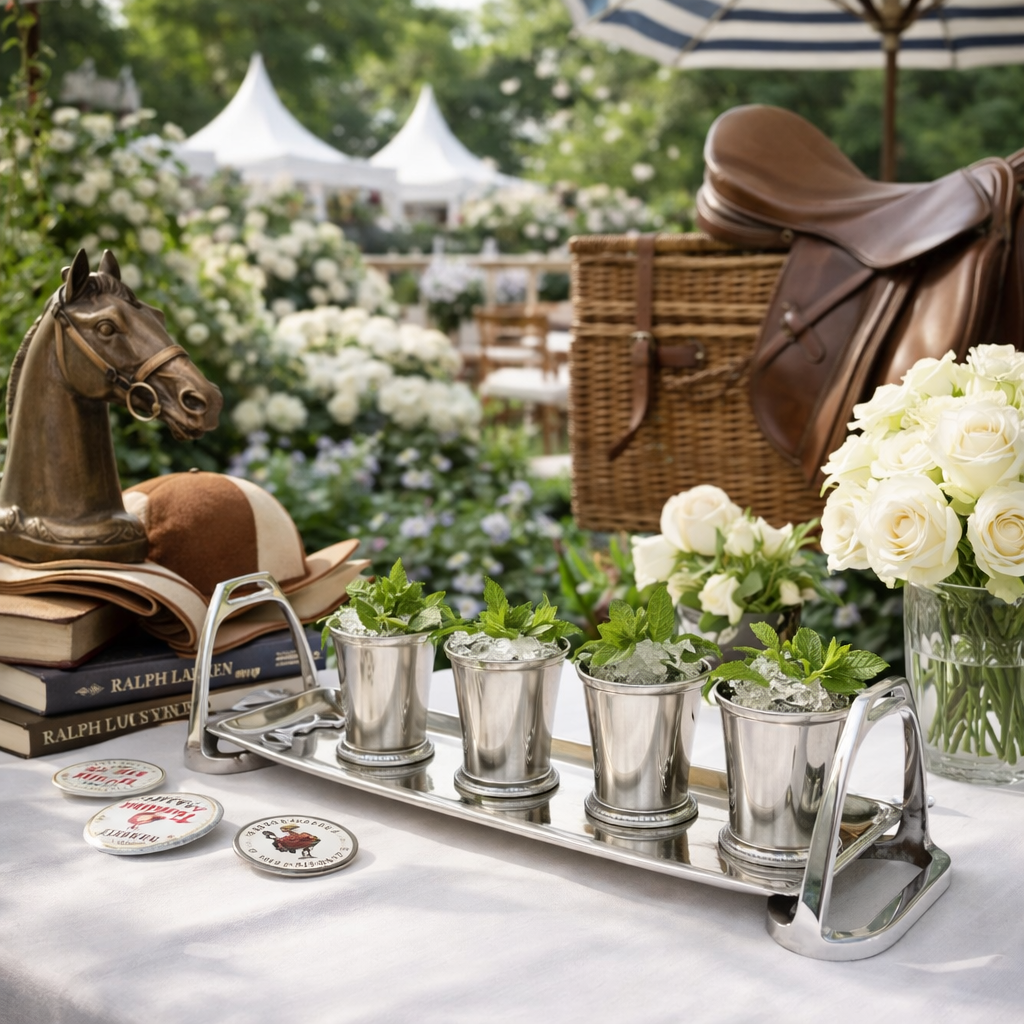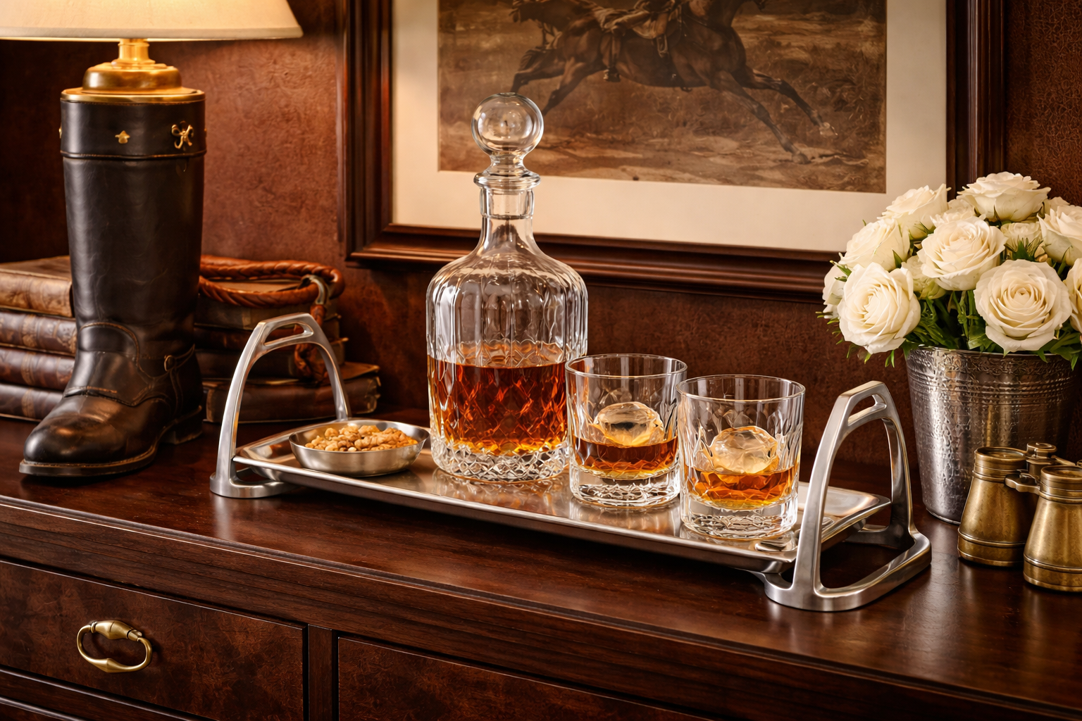 This tray is the definition of understated sophistication. The elongated form and sculptural stirrup-inspired handles give it a subtle equestrian nod without feeling literal or kitschy. It’s sleek, balanced, and endlessly versatile—equally at home in a polished bar vignette, a well-appointed butler’s pantry, or styled atop a console with collected objects.