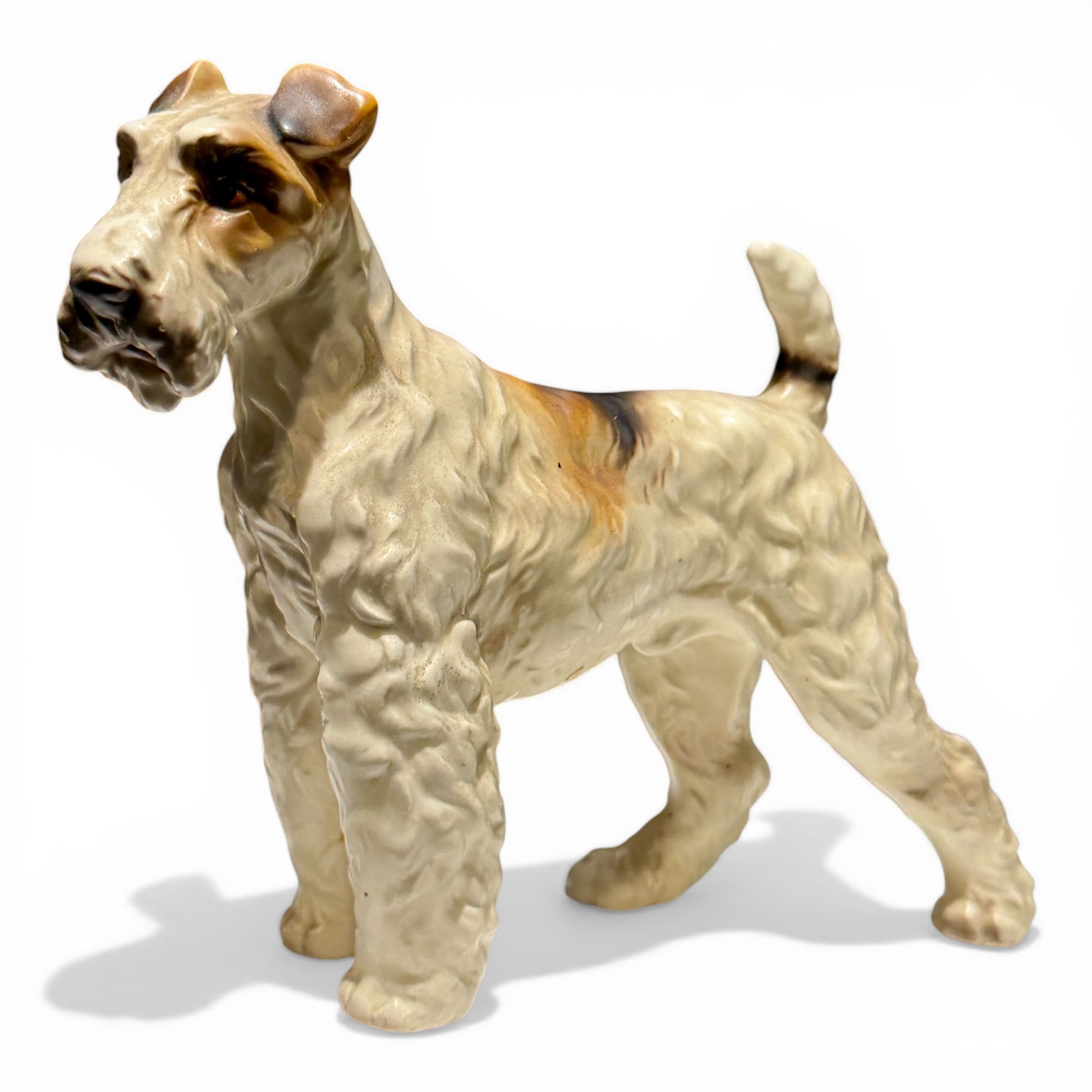 A beautifully modeled Wire Fox Terrier captured mid-stance, this vintage figurine embodies the alert, intelligent character the breed is known for. The sculpting is particularly well executed, with textured fur, defined musculature, and expressive facial detailing. Hand-painted in a classic palette of cream, warm tan, and black accents, this piece has the timeless appeal of traditional English sporting décor. Whether styled atop a stack of leather-bound books or placed within a curated library vignette, it brings an unmistakable sense of heritage and refinement.